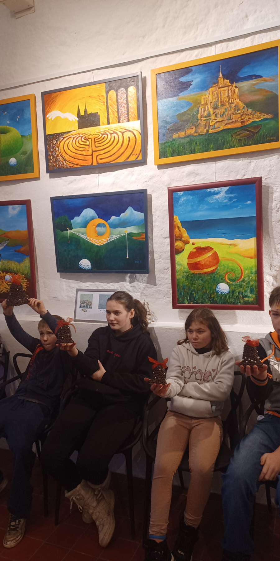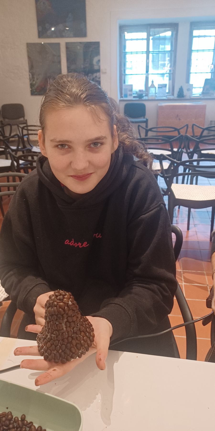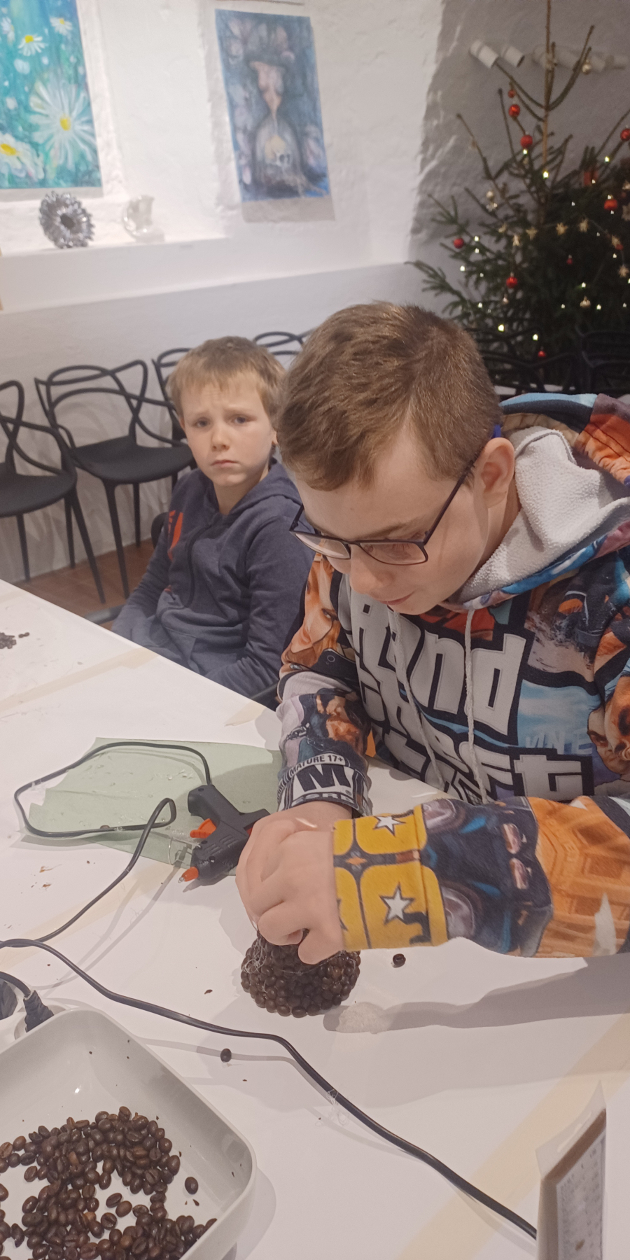 Tentokrát jsme se společně věnovali výtvarnému tvoření s vánoční tematikou. Žáci pracovali s polystyrenovými zvonečky, které nejprve nabarvili a následně polepili kávovými zrnky pomocí tavné pistole. Precizní práce „zrníčko po zrníčku“ podpořila rozvoj jemné motoriky, soustředění i trpělivosti a zároveň děti seznámila s další výtvarnou technikou.